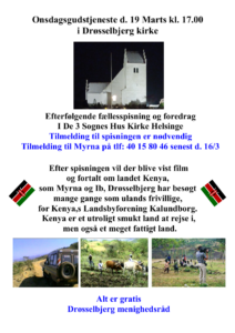 Efter spisningen vil der blive vist en film og fortalt om landet Kenya, som Myrna og Ib har besøgt mange gange som ulandsfrivillige for Kenya's landsbyforening…